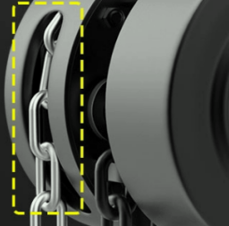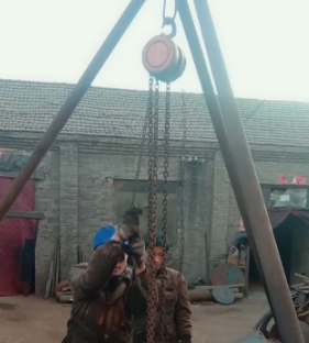 圖片上有一個起重三腳架,在三腳架的下方還懸掛著一個小型的工具,它有圓圓的罩殼,長長的鏈條,有多少人叫它倒鏈,又